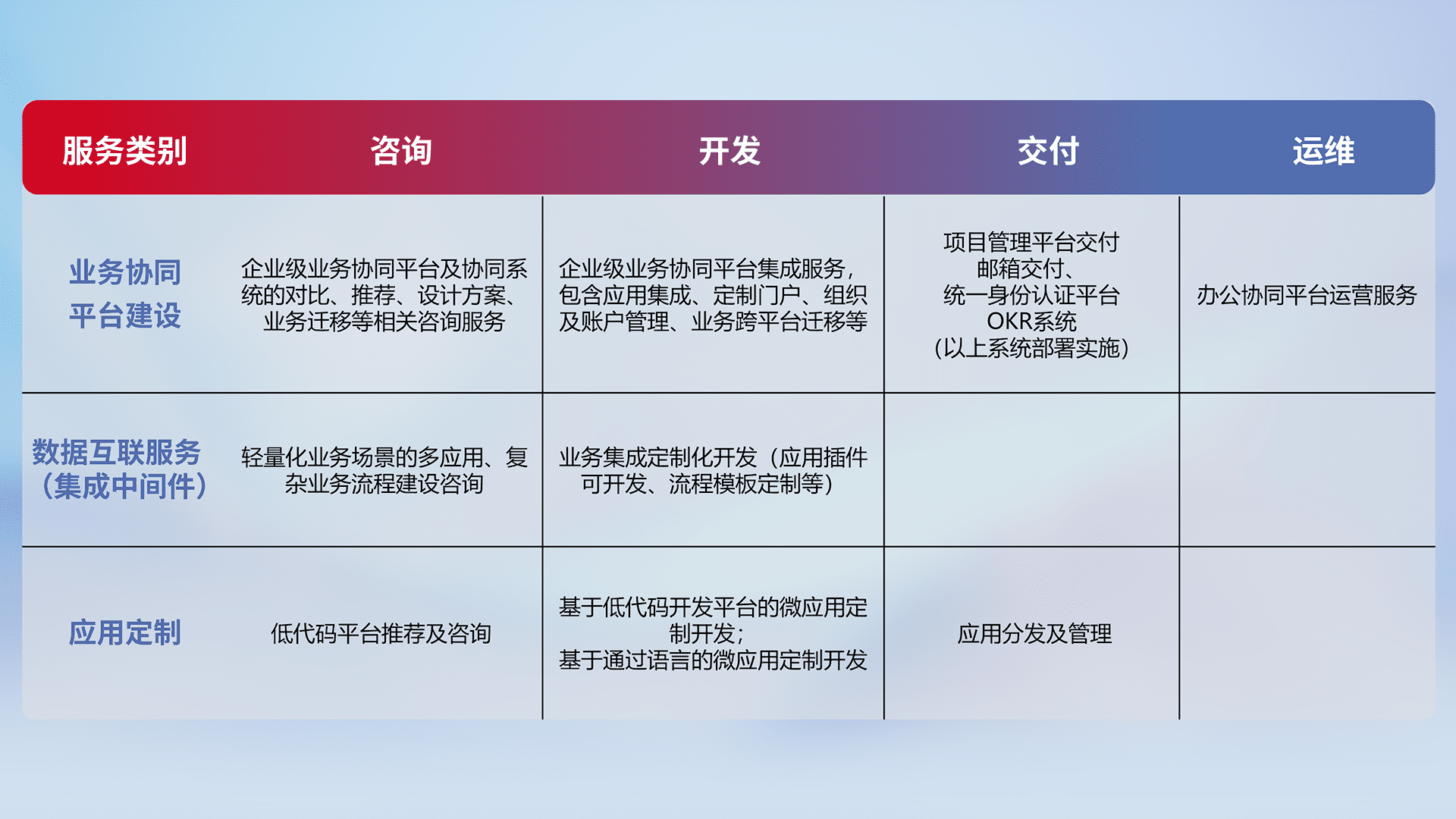 针对钉钉、、、企微、、、IDaas等平台级产品提供产品的规划、、、方案、、、交付、、定制化开发等服务,,,实现如统一协同办公、、、智能客户服务、、、混合会议管理、、、、智能数据查询、、、、等业务场景,,,实现数字化转型。。。。